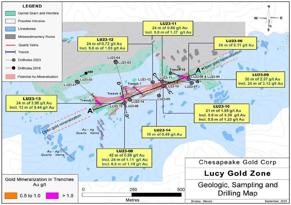 Alan Pangbourne, CEO, commented, “While Chesapeake’s primary focus has been advancing the metallurgical work and the oxidative leach technology at Metates, we have continued systematic exploration on our highly prospective regional projects. We are very excited about the first phase of drill results at Lucy. The drill results suggest a mineralized skarn that outcrops at surface, and the system has been traced over a strike length of at least 500 metres. Follow-up exploration is planned to better evaluate the scope and scale of this new discovery.”