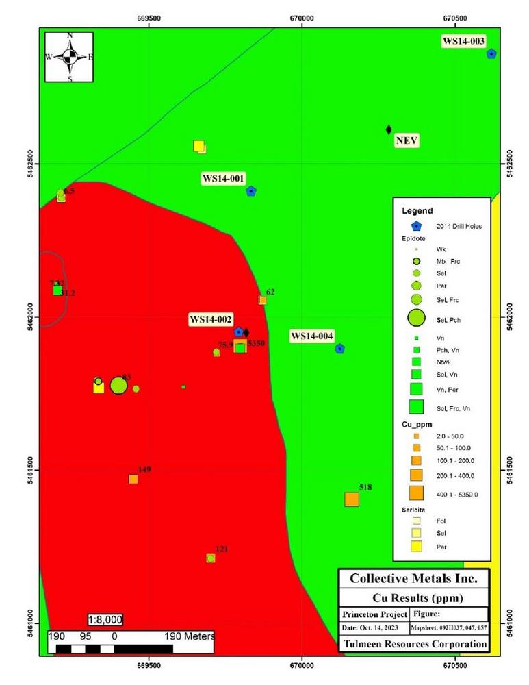 COLLECTIVE METALS INC. (CSE: COMT | OTC: CLLMF | FSE: TO1) (das "Unternehmen" oder "Collective" – https://www.commodity-tv.com/ondemand/companies/profil/collective-metals-inc/ ) gibt die integrierten Ergebnisse seines ersten Programms bekannt, das im Rahmen der Due-Diligence-Prüfung des Projekts Princeton (das "Grundstück") durchgeführt wurde. Das Feldprogramm Anfang Juni umfasste eine grundstücksweite Überprüfung der aufgezeichneten Mineralisierung und Alteration mit besonderem Schwerpunkt auf dem Trojan-Condor-Korridor, einem > 2 km langen, nach Nordosten verlaufenden geophysikalischen und geochemischen Zielgebiet etwa 10 km südwestlich der derzeit produzierenden Mine Copper Mountain von HudBay Minerals Inc. Frühere Betreiber haben entlang des Korridors mehrere Vorkommen von Kupfermineralisierungen identifiziert, die mit kleinen mittel- bis mafischen Intrusionen in Verbindung stehen. Die Geologen des Kollektivs lokalisierten, untersuchten und beprobten Aufschlüsse im Zusammenhang mit dem Trojan-Vorkommen, der Diorit-Intrusion, die es beherbergt, und dem angrenzenden Vulkangestein der Nicola-Gruppe. Im Gegensatz zu früheren Explorationsprogrammen wurden die Gesteinsproben überwiegend aus Aufschlüssen oder Unteraufschlüssen entnommen und nicht aus lokalem Flotationsmaterial.