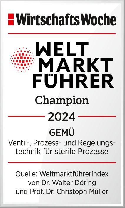 Die WirtschaftsWoche verleiht nun zum achten Mal in Folge dem inhabergeführten Ventilspezialisten GEMÜ das WirtschaftsWoche-Qualitätssiegel „Weltmarktführer – Champion 2024“. Damit würdigt die WirtschaftsWoche die erneute Aufnahme von GEMÜ in den Weltmarktführerindex im Segment „Armaturen und Automatisierungskomponenten: Ventil-, Prozess- und Regelungstechnik für sterile Prozesse“.