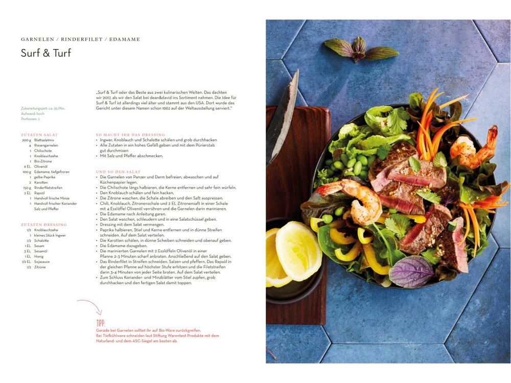 Wer darüber hinaus hinter die Kulissen von dean&david blicken möchte, findet neben den 50 kreativen Salatrezepten und jede Menge Tipps und Tricks rund ums moderne und gesunde Kochen, sowie ein Interview mit David Baumgartner und eines mit Teresa Tesche, die seit der Gründung 2007 als Product Development Director bei dean&david arbeitet.