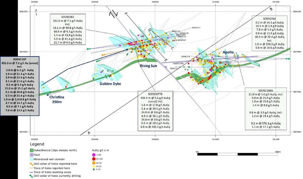 • Das Bohrloch wurde niedergebracht, um die Streichenausdehnung und die Kontinuität von 12 hochgradigen Aderstrukturen 20 m entlang des Streichens und neigungsabwärts von SDDSC077B (404,4 m @ 5,6 g/t AuEq (ungeschnitten)) zu erproben (Abbildungen 3, 4, 5).