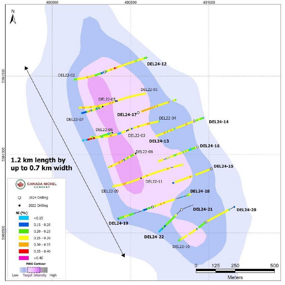 - 11 Bohrungen wurden erfolgreich abgeschlossen, darunter DEL24-12 mit 0,26 % Nickel auf 431 Metern und DEL24-17 mit 0,27 % Nickel auf 293 Metern.