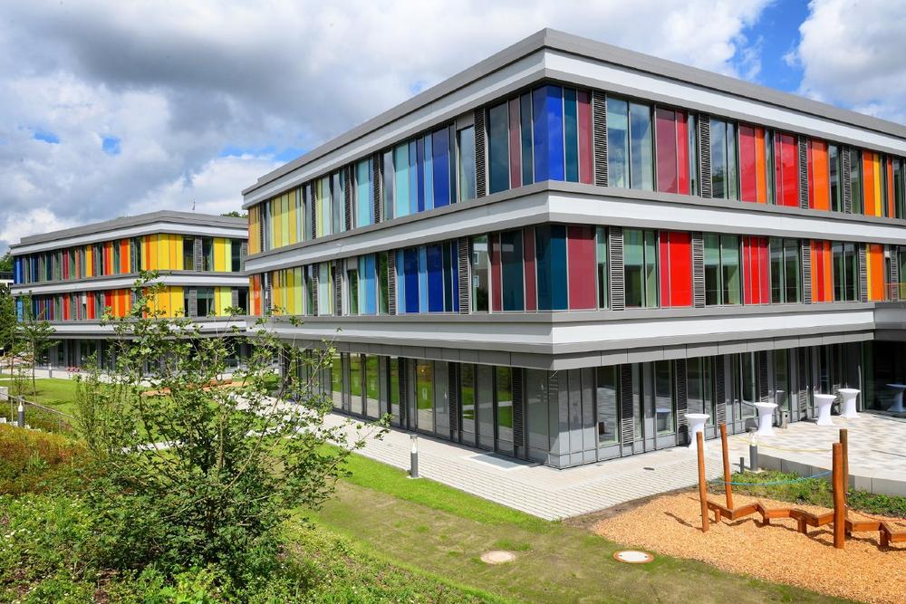 Das drei Geschosshöhen übergreifende Foyer schließt nach oben mit einer zwölf mal vier Meter großen Glasfläche ab. Die das Gebäude umhüllende Pfosten-Riegel-Fassade von Schüco ermöglicht großformatige Glasflächen, die reichlich Tageslicht einströmen lassen. Die Fassadenelemente sind Cradle to Cradle zertifiziert, was eine sortenreine Materialtrennung garantiert. Die verwendeten Rohstoffe bleiben somit auch zukünftigen Generationen erhalten und können eines Tages wieder dem Rohstoffkreislauf beigefügt werden. Dank äußerst schlanker Profile erlauben die Schüco Fensterelemente auf den Etagen einen Panoramablick über das begrünte Dach gen Bethel, wo sich die Einrichtungen der von Bodelschwinghschen Stiftungen nahtlos in das Bielefelder Stadtbild einfügen.