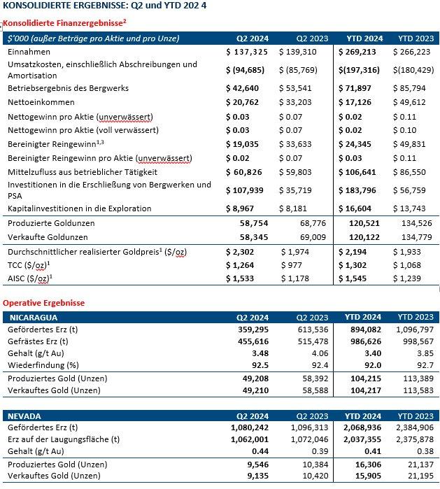 - Konsolidierte TCC1 von 1.264 $/oz; Nicaragua 1.232 $/oz und Nevada 1.435 $/oz;