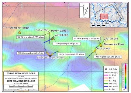 Abschluss von 1.815 Meter Bohrungen in vier Bohrlöchern in den zuvor ungetesteten Payoff- und Severance-Gebieten, die 500 und 1000 Meter von dem erfolgreichen Erstbohrprogramm 2023 entfernt liegen, bei dem in Bohrloch ALT-23-001 eine Länge von 211,65 Metern mit einem Gehalt von 0,46 g/t Gold durchteuft wurde.