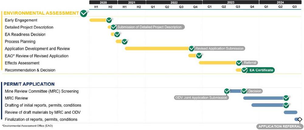 – Die Genehmigungen nach dem BC Mines Act und dem Environmental Management Act wurden bereits ausgearbeitet und werden derzeit vom Unternehmen und dem Mine Review Committee geprüft.