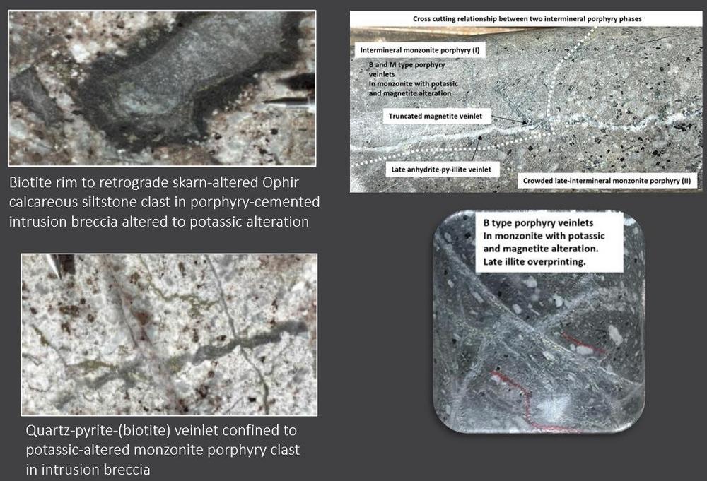 – Drill core to date has shown that carbonate rocks in the intrusion breccia are marbleized and, in places, altered to retrograde skarn. Some discrete intervals comprise a finer-grained monzonite porphyry which is cut by porphyry-style quartz and magnetite veinlets, some containing pyrite and molybdenite with clear B-type affinity (see Figure 1). These inter-mineral intercepts, only approximated in Figure 3, are considered as blocks or screens ‚floating‘ in the late-mineral phases, indicating that there are early and likely better mineralized inter-mineral intrusive phases to be found at Big Hill.
