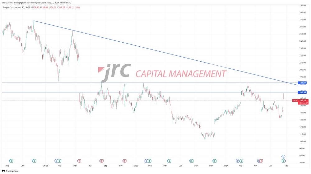 Betrachtet man den Chart der Target Corporation Aktie, ist ein langfristiger Abwärtstrend seit 2021 zu erkennen, der bis heute standgehalten hat. Durch die heutige Explosion der Aktie wurde ein kurzfristiger Abwärtstrend seit April dieses Jahres durchbrochen.
