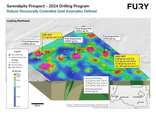 Fury Gold Mines Limited (TSX: FURY, NYSE American: FURY) ("Fury" oder das "Unternehmen" – https://www.commodity-tv.com/ondemand/companies/profil/fury-gold-mines-ltd/) freut sich, die Ergebnisse des Kernbohrprogramms 2024 auf dem Greenfield-Projekt Serendipity auf dem zu 100 % unternehmenseigenen Projekt Eau Claire im Gebiet Eeyou Istchee in der Region James Bay in Quebec bekannt zu geben. Das Konzessionsgebiet Serendipity befindet sich im selben aussichtsreichen geologischen Umfeld wie die unternehmenseigene Lagerstätte Percival. Insgesamt wurden 3.871 Meter (m) in 10 Löchern auf fünf verschiedenen Zielen bei Serendipity gebohrt. Bohrloch 24SD-009 zielte auf eine biogeochemische Anomalie, die über der östlichen Erweiterung der Struktur liegt, die die Mineralisierung bei Serendipity kontrolliert, und durchschnitt 12,16 g/t Gold auf 3,0 m (Abbildungen 1 und 2, Tabelle 1). Bohrloch 24SD-002 zielte auf eine biogeochemische Anomalie am Scharnier einer interpretierten Falte innerhalb der vulkanischen Stratigraphie und durchschnitt 5,27 g/t Gold auf 1,0 m. Die beiden oben erwähnten Abschnitte sind über 2 Kilometer voneinander entfernt, was auf das Potenzial für ein großes Mineralisierungssystem bei Serendipity hinweist. Das Unternehmen plant derzeit Anschlussbohrungen auf Serendipity für das Jahr 2025.