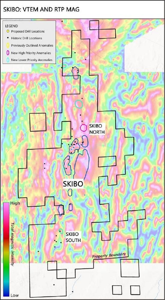 Thirty-eight core holes have been historically drilled in the Skibo prospect; nineteen of those with verifiable assay data and most of those historical assays show that only copper (Cu), nickel (Ni) ± platinum group metals (PGM) were evaluated. Observations of the geology associated with the Titac titanium prospect to the south of Skibo indicate that the OUI encountered in the historical drilling at Skibo could have potential for titanium-vanadium mineralization, in addition to the known Cu-Ni-PGM mineralization, but the samples were not analyzed for these elements. During a recent analysis of historical geophysical data (See September 5, 2024 News Release), the Company defined several new OUI targets at the Skibo prospect, as well as verifying OUI already known. Several drill locations have been proposed based on this and other reviews of the Skibo data.