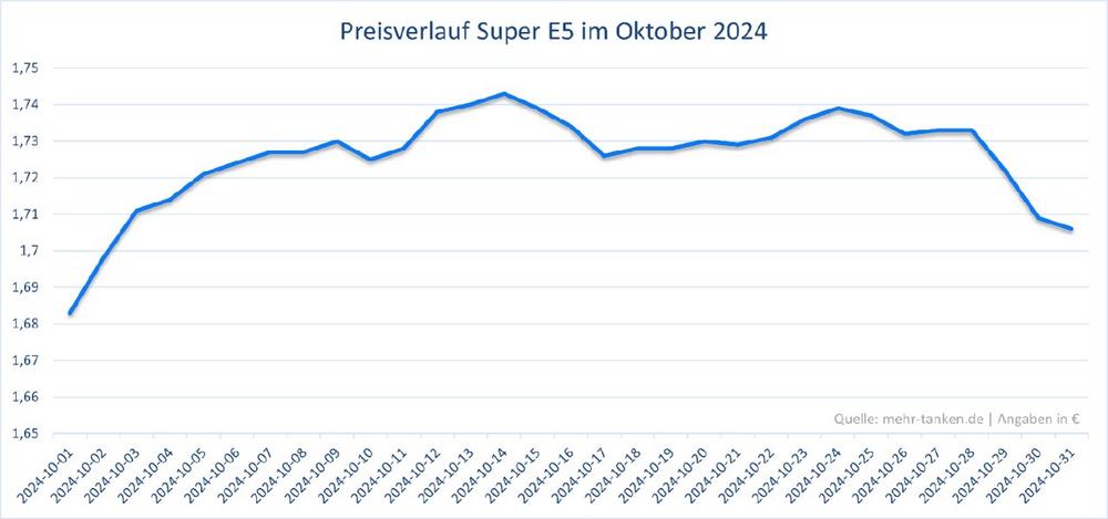 Der niedrigste Preis wurde zu Monatsbeginn registriert, gefolgt von einem stetigen Anstieg mit leichten Schwankungen zur Monatsmitte. Der Höchststand war am 14. Oktober mit 1,743 Euro pro Liter für Super E5 erreicht. Günstig tanken konnte man dienstags und mittwochs, während die Preise sonntags und montags am höchsten waren.