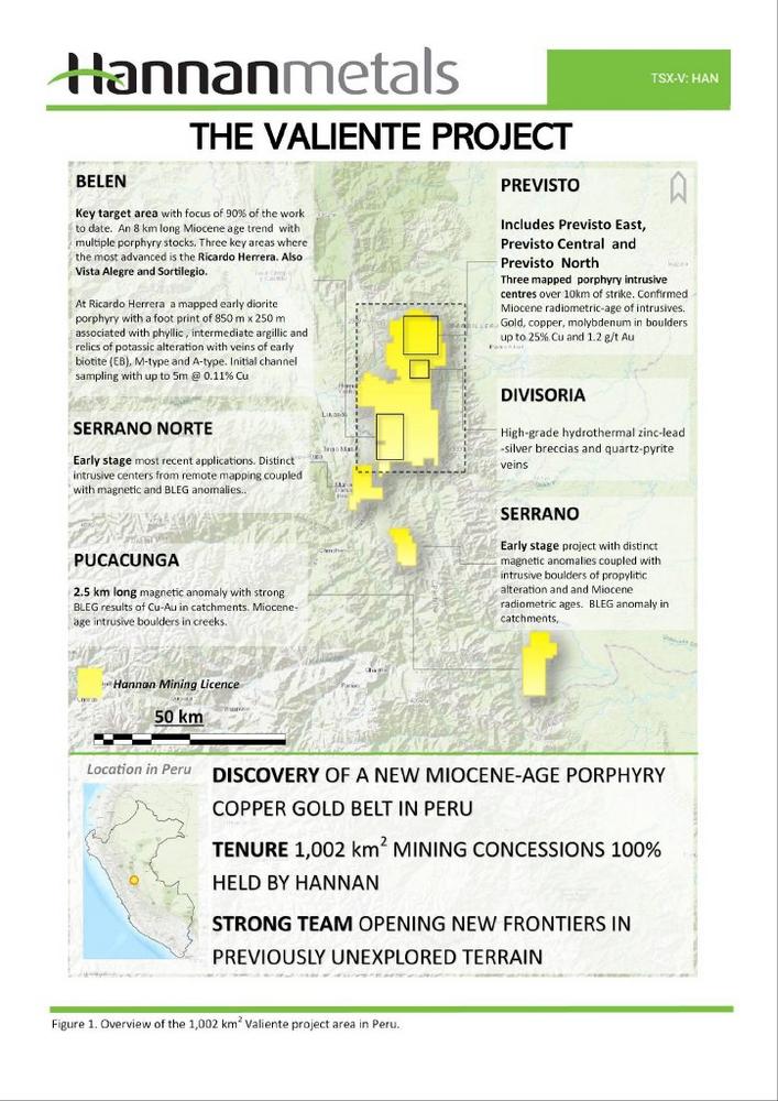 Hannan Metals‘ Valiente Project identified a Miocene porphyry copper-gold belt in Peru’s back-arc, with 18 Cu-Au porphyry and epithermal systems across 140 km x 50 km. The Belen Prospect (Figure 1), 19 km east of Tingo Maria, features three main targets: Ricardo Herrera, Vista Alegre, and Sortilegio. Despite being only 4% of Hannan’s holdings, Belen shows significant potential through extensive anomalies.