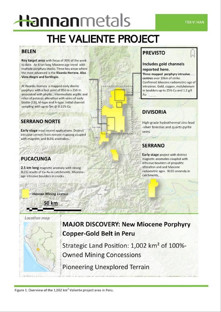 “The alkalic-type epithermal gold style of mineralization is encouraging, as these systems globally can develop into large, high-grade deposits. We are in the very early stages here – these results comes from initial channel sampling, and we have multiple untested targets across the 4 km x 4 km soil gold anomaly. “Hannan’s strategy is to systematically explore the new Valiente mineral belt gaining drill permits progressively as we make further discoveries. With Peru’s improving and transparent drill permitting system, we look forward to drilling at Belen in Q2 2025, located 20 km to the SW of Previsto, while we derisk this new gold finding to achieve staged drill programs across the entire 150 km long Valiente gold-copper project.”Further information is attached.