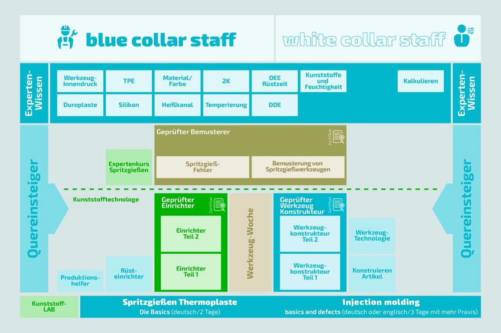 Entry into injection molding production often begins with training as a set-up technician. This position closes the gap between unskilled employees and trained setters or plastics technologists. The set-up technician is responsible for the economical and safe set-up of injection molds. The five-day course includes theoretical basics and a high practical component, which enables participants to carry out several set-up processes under supervision and ends with an examination. The tasks include set-up preparation, setting “zero points”, handling hot runners and mold maintenance.