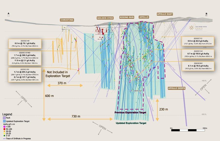 A total of 85 mineralized vein set shapes were created for the Exploration Target of 18 contained high-grade internal shapes (at Rising Sun and Apollo, but not Golden Dyke due to the lack of drill data) were defined (Table 3 & Table 4). A total of 70 of the vein set shapes had grades estimated from composited assay data, while 15 vein set shapes used the average calculated grade of either Rising Sun (lower case 7.8 g/t Au and 0.8% Sb and upper case 11.5 g/t Au and 1.0% Sb), Apollo (lower case 3.8 g/t Au and 0.7% Sb and upper case 4.1 g/t Au and 0.7% Sb) or Golden Dyke (lower and upper case 5.6 g/t Au, 1.0% Sb) and this was applied to the Exploration Target. Drilling indicates Rising Sun could contain higher gold and antimony grades than Apollo and Apollo Deep, with Golden Dyke not yet being tested to depth to determine the propensity of higher grades.