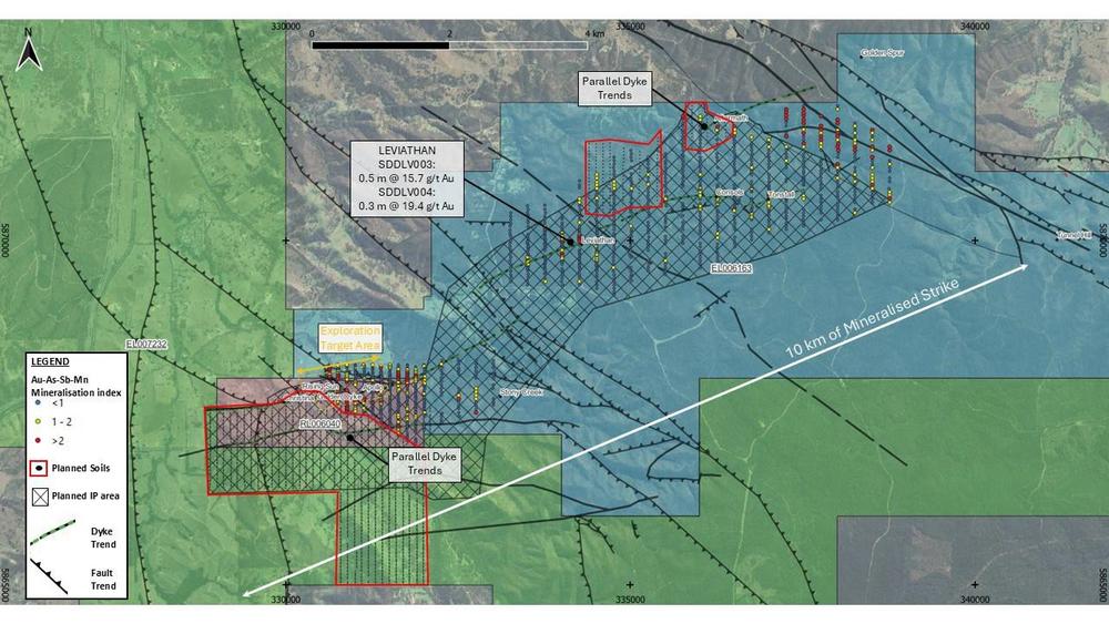 o Die IP-Untersuchung erstreckte sich über 12 km2 und deckt 6 km Streichen (von den 12 km) des goldmineralisierten Deich- und alterierten Sedimenttrends ab, der bedeutende historische Bergbaugebiete einschließlich Tonstal, Leviathan, Consols und Aftermath umfasst. Parallele Deichtrends wurden ebenfalls erprobt. Die Analyse und Interpretation ist noch im Gange; weitere Ergebnisse werden nach Abschluss der Arbeiten veröffentlicht.