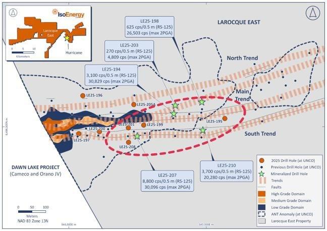 The Hurricane South trend, where winter drill holes LE25-207 and LE25-210 intersected strong radioactivity. Hole LE25-207, located 240 m east of Hurricane, returned an average RS-125 reading on over 0.5 metres on core of 8,800 cps and a corresponding downhole probe maximum reading of 30,096 cps, while LE25-210, drilled 480 metres east of Hurricane, intersected up to 3,700 cps averaged over 0.5 m on core and a corresponding downhole probe maximum reading of 20,280 cps.