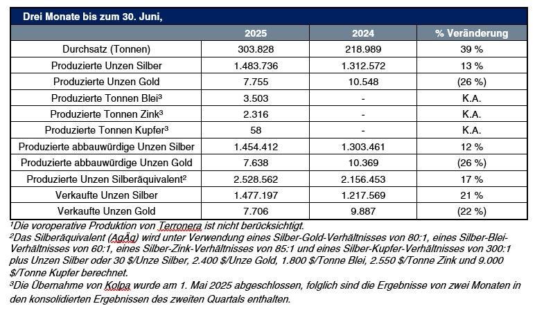 • Metallverkäufe und Lagerbestände: Im zweiten Quartal wurden 1.477.197 Unzen Silber und 7.706 Unzen Gold verkauft. Zum 30. Juni 2025 umfassten die Lagerbestände insgesamt 242.980 Unzen Silber und 701 Unzen Gold in Barrenform sowie 24.970 Unzen Silber und 399 Unzen Gold in Konzentratform.