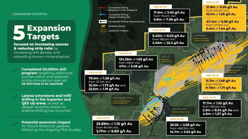 Michael Henrichsen, CEO of Goldshore commented, "We’re pleased with the continued positive results from the winter drilling with follow-up holes at the QES Zone intersecting wide intercepts of gold mineralized structure with some shears providing higher mineralization closer to surface. These results further support the potential for this region to support rapid payback in the early years of mining. This successful winter program sets the stage for our recently announced 50,000-meter drill program, focused on further resource expansion (29,000 meters) and grade control drilling (21,000 meters) which will ultimately set the stage for the infill drill program in 2026."