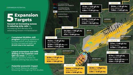 Figure 1 shows the location of the drill holes being reported with respect to the planned winter drill program, while Figure 2 illustrates a cross section through drill hole MMD-25-185 that demonstrates the potential to extend the mineralized shears zones of the Southwest zone to depth. Tables 2 & 3 summarize significant intercepts and drill hole locations, respectively. All seven drill holes were drilled to infill a data gap between shallow and deep intercepts at the Southwest Zone and a consequent gap in the resource model that is treated as waste in the pit optimization process.
