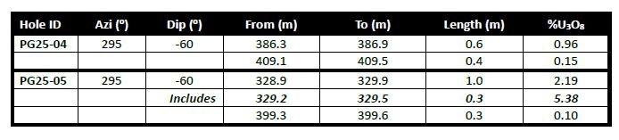 - Select samples from hole PG25-05 averaged 2.2% U₃O₈ over 1.0 metre, including 5.4% U₃O₈ over 0.3 metres.