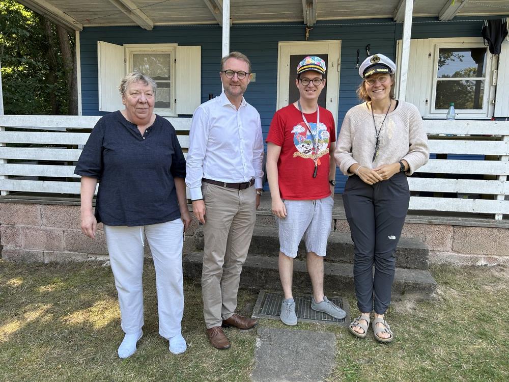Spiel, Spaß und Action – und das mitten in der Natur: „Es ist großartig, dass der Landkreis Plön unserem Zeltlager in Landenhausen auch nach so vielen Jahren die Treue hält und jedes Jahr auf’s Neue mit vielen Kindern anreist und 14 Tage in unserem schönen Vogelsberg verbringt“, sagt Landrat Dr. Jens Mischak (Zweiter von links), als er die Lagerleiterin Lea Gundlach (rechts) und Betreuer Yannik Hinske (Zweiter von rechts) aus dem Landkreis Plön in Schleswig-Holstein begrüßt. Seit 65 Jahren schon fährt jedes Jahr eine Gruppe mit mehr als 200 Kindern und Betreuern aus dem Landkreis ins Zeltlager nach Landenhausen. Als „die schönste Zeit des Jahres“ beschreibt Lea Gundlach die zwei Wochen im Vogelsbergkreis und freut sich, dass Landrat Dr. Mischak gemeinsam mit Silvia Lucas (links) aus dem Sachgebiet Jugendarbeit, Jugendbildung, Demokratieförderung im Jugendamt des Vogelsbergkreises persönlich vorbeikommt, um die Gruppe im Kreisjugendheim zu begrüßen. „Ich hoffe, Sie kommen auch in den kommenden Jahren immer wieder gern zu uns“, so der Landrat abschließend.