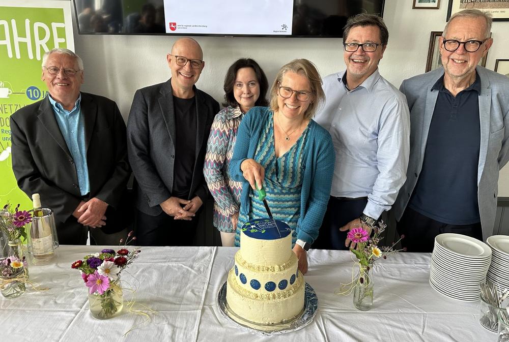 Das 23. Austausch-Treffen am Freitag, 22. August, war gleichzeitig Kulisse für das zehnjährige Jubiläum und fand im jüngsten Dorfladen der Region statt: Das DorfHaus in Lenthe besteht seit 2021. Die Dorfgemeinschaft kann hier an vier Tagen in der Woche einkaufen, im Café verweilen und sich austauschen. Jürgen Ermerling, Ortsbürgermeister von Lenthe und Vorstandsmitglied des DorfHauses, berichtet: „Es gab bei uns im Dorf schon lange den Wunsch, endlich wieder eine Einkaufsmöglichkeit vor Ort zu schaffen. 2014 haben wir uns auf den Weg gemacht. Nach unzähligen Gesprächen und der Zusage von EU-Fördermitteln haben wir 2017 eine Genossenschaft gegründet und konnten durch die finanzielle Unterstützung der Dorfgemeinschaft und der Genossenschaftsmitglieder und mit Hilfe des Knowhows des Netzwerks 2021 eröffnen. Seitdem entwickelt sich unser DorfHaus stetig weiter und ist mit Live-Konzerten und Ausstellungen ein Ort für das Zusammenkommen, Klönen und Lachen geworden.“