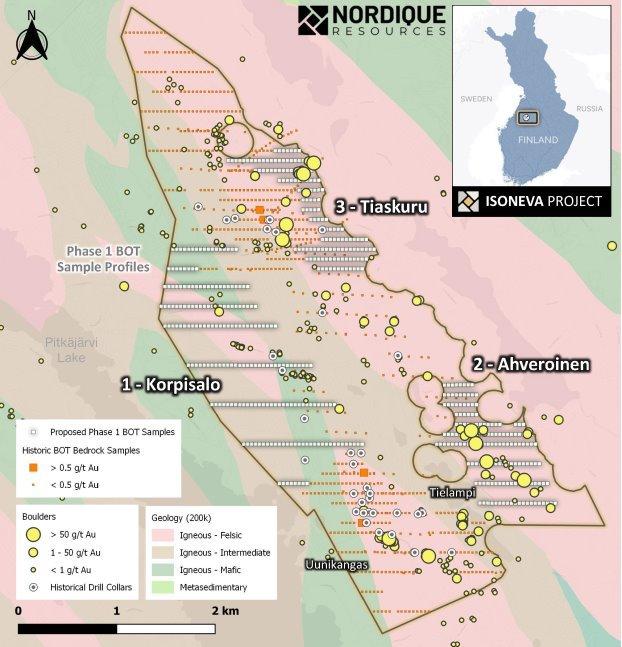 1 Die Findlinge stammen aus zwei Quellen: Findlinge, die von Gemdale Gold Inc. oder früheren Betreibern gesammelt und zur Analyse eingeschickt wurden, wobei Laborberichte vorliegen, sowie frei zugängliche Online-Daten der finnischen geologischen Behörde zu Proben, die zur Analyse eingeschickt wurden. Die Leser werden darauf hingewiesen, dass die Entnahme von Proben naturgemäß selektiv ist und die oben angegebenen Ergebnisse nicht unbedingt repräsentativ für die Mineralisierung im Konzessionsgebiet Isoneva sind.