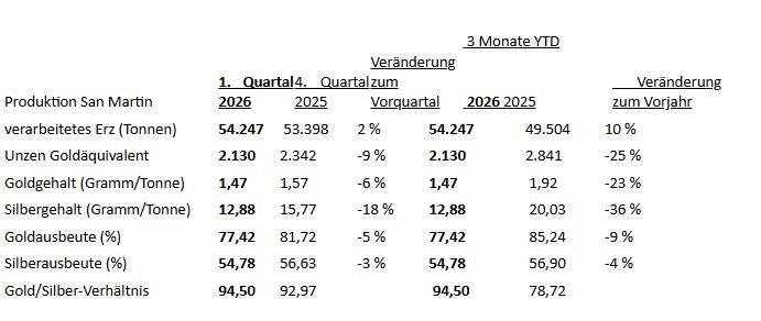 Hinsichtlich des Oxiderzes, das in der Pressemeldung zu den Ergebnissen des vorangegangenen Quartals erwähnt wurde, hat das Gebiet San Jose Mine, das sich im südlichen Bereich der Mine San Martin befindet und wo der Betrieb von San Martin vor mehr als 30 Jahren begann, beträchtliche Reserven in der Tiefe ergeben. Diese Reserven werden derzeit erschlossen und aufbereitet, um die Oxidanlage zusätzlich zu dem Erz aus der Mine San Martin zu beschicken. Die Gewinnungsraten fallen jedoch etwas geringer aus als jene des Erzes aus San Martin und es konnte festgestellt werden, dass die Tonsteine, die aus kohlenstoffhaltigem Schiefer bestehen, Gold und Silber aus dem oxidierten Erz absorbieren, wenn sie während der Aufbereitung mit der Zyanidlösung in Berührung kommen. Dies führte daher zu Rückständen mit höherem Feststoffanteil und geringeren Gewinnungsraten, wie die Quartalsergebnisse zeigen. Dieses Problem wurde nach metallurgischen Untersuchungen identifiziert und der Prozess wird entsprechend angepasst.