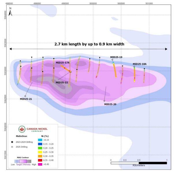 - MID25-18A durchteufte 0,29 % Nickel über 449,0 Meter, einschließlich 0,36 % Nickel über 10,5 Meter