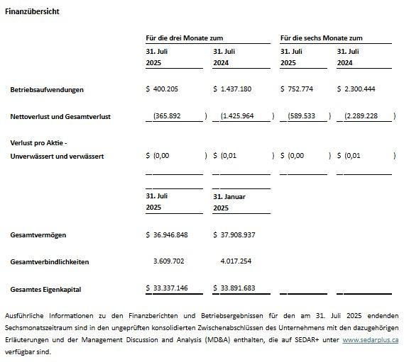 Die Ausgangssprache (in der Regel Englisch), in der der Originaltext veröffentlicht wird, ist die offizielle, autorisierte und rechtsgültige Version. Diese Übersetzung wird zur besseren Verständigung mitgeliefert. Die deutschsprachige Fassung kann gekürzt oder zusammengefasst sein. Es wird keine Verantwortung oder Haftung für den Inhalt, die Richtigkeit, die Angemessenheit oder die Genauigkeit dieser Übersetzung übernommen. Aus Sicht des Übersetzers stellt die Meldung keine Kauf- oder Verkaufsempfehlung dar! Bitte beachten Sie die englische Originalmeldung auf www.sedarplus.ca, www.sec.gov, www.asx.com.au/ oder auf der Firmenwebsite!
