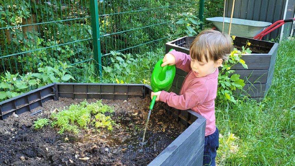 Ein zentraler Baustein ist der eigene Gemüsegarten. Von Beginn an bringen die Kinder ihre Ideen in die Gestaltung ein: vom Anpflanzen verschiedener Obst- und Gemüsesorten bis hin zu fantasievollen Vorstellungen wie einem kleinen See. Durch die aktive Teilnahme erleben sie sich als Akteure und entdecken, wie ihre Ideen Gestalt annehmen.