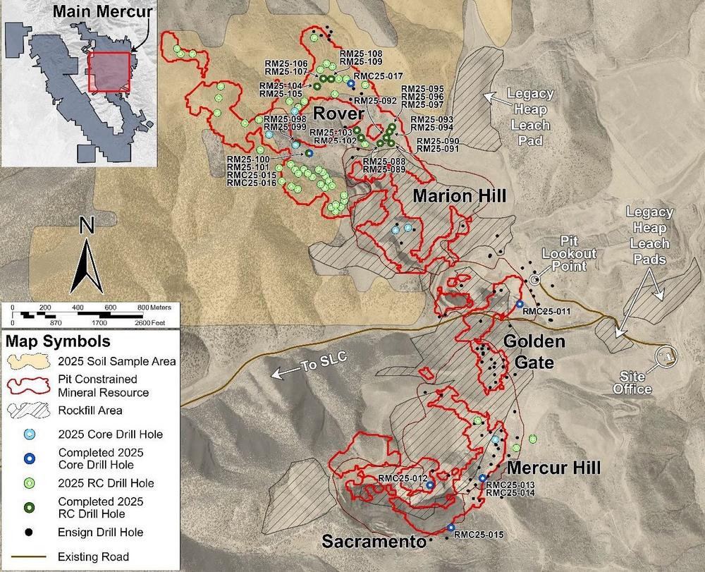 - Schwerpunkt der Kernbohrungen ist weiterhin die Gewinnung von repräsentativen metallurgischen Proben im gesamten Gebiet Main Mercur. Die Durchführung der geplanten Kernbohrungen bei South Mercur in diesem Jahr steht nach wie vor unter dem Vorbehalt des Erhalts der Genehmigung durch die Öl-, Gas- und Bergbaubehörde von Utah.