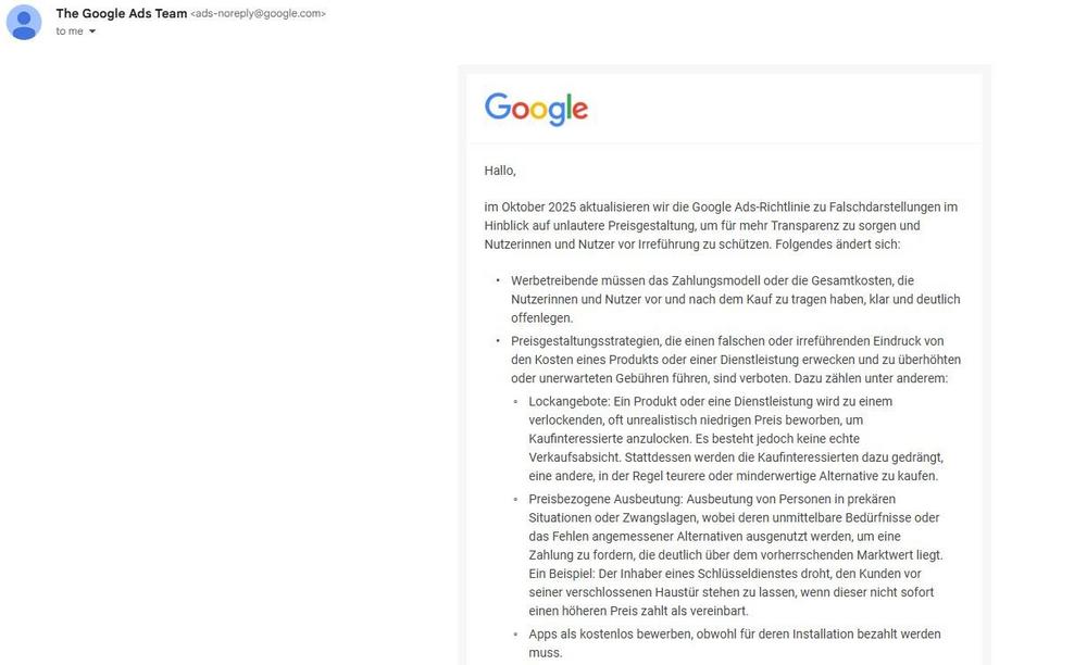 In der offiziellen E-Mail weist Google darauf hin, dass Google-Ads-Werbetreibende ihre jeweiligen Preis- und Zahlungsmodelle klar und deutlich offenlegen müssen. Die Nutzerinnen und Nutzer müssen nachvollziehen können, welche Gesamtkosten sie vor und nach einem Kauf zu tragen haben.