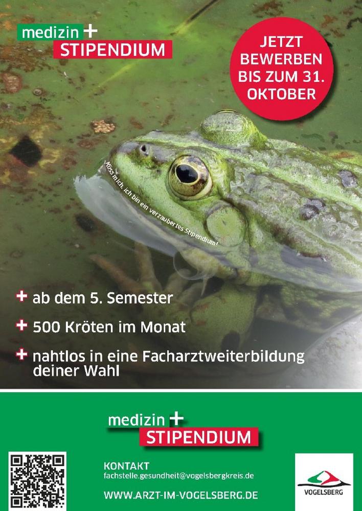 Das Stipendium gibt es seit 2016 und ist offen für alle Fachrichtungen der unmittelbaren Patientenversorgung, also zum Beispiel Allgemeinmedizin, Gynäkologie, Dermatologie oder Augenheilkunde. Es unterstützt Medizinstudenten ab dem 5. Semester mit 500 Euro monatlich. Dafür verpflichtet sich der Student seine Facharztweiterbildung (weitestgehend) im Vogelsberg durchzuführen und sich im Anschluss mindestens drei Jahre niederzulassen.