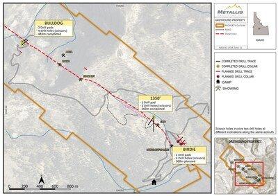 Im Zielgebiet Birdie sind vier Bohrungen mit einer Gesamtlänge von etwa 500 m geplant (siehe Abbildung 5). Das Bohrgerät befindet sich derzeit bei Upper Birdie, wo zwei Scherenbohrungen unterhalb des oberen Portals geplant sind. Zwei weitere Bohrungen sind auf einer anderen Plattform 50 m südöstlich am Lower Birdie geplant (siehe Karte 1). Das Zielgebiet Birdie befindet sich auf einem parallelen Trend zur Hauptscherzone Greyhound. Die Ergebnisse der Bohrungen werden voraussichtlich unser Verständnis der parallelen Scherzonen verbessern.