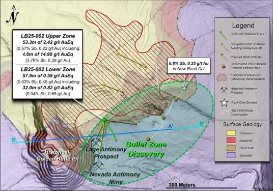 o LB25-002 Obere Zone (ab Oberfläche): 14,90 g/t AuÄq* über 4,6 Meter (3,76 % Sb und 0,29 g/t Au), in 2,42 g/t AuÄq* über 53,3 Meter (0,57 % Sb und 0,22 g/t Au)