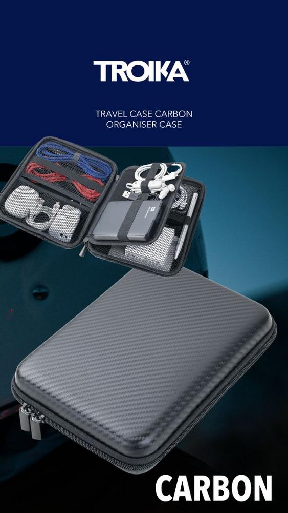 Das TRAVEL CASE CARBON ist der smarte Allrounder für unterwegs: ob Kabel, Adapter, Ladegeräte, Schminkutensilien oder Reiseapotheke – alles findet seinen Platz. Drei Innenfächer, sechs Elastikband-Schlaufen und eine praktische Trennwand sorgen für perfekte Übersicht. Das stabile Hardcover schützt den Inhalt zuverlässig, während die edle Carbon-Optik für den stilvollen Auftritt sorgt.