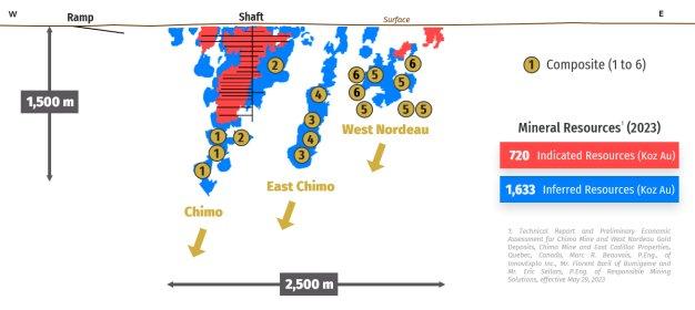 Eine wirtschaftliche Erstbewertung (PEA) belegte unter Verwendung eines Goldpreises von 1.750 US$ pro Unze die Wirtschaftlichkeit eines 2-km-Teilabschnitts – verglichen mit den gesamten 15 km, die Gegenstand des 100.000 m umfassenden Bohrprogramms sein werden – und ergab eine durchschnittliche Goldproduktion von 116.900 Unzen pro Jahr für eine Lebensdauer der Mine von 9,7 Jahren. Die angedeuteten Ressourcen werden auf 720.000 Unzen (7,1 Millionen Tonnen mit 3,1 g/t Au) geschätzt, die vermuteten Ressourcen auf 1.633.000 Unzen (18,5 Millionen Tonnen mit 2,8 g/t Au). Siehe NI 43-101-konformen „Technical Report and Preliminary Economic Assessment for Chimo Mine and West Nordeau Gold Deposits, Chimo Mine and East Cadillac Properties, Quebec, Canada, Marc R. Beauvais, P.Eng., of InnovExplo Inc., Mr. Florent Baril of Bumigeme and Mr. Eric Sellars, P.Eng. of Responsible Mining Solutions“ vom 29. Mai 2023.