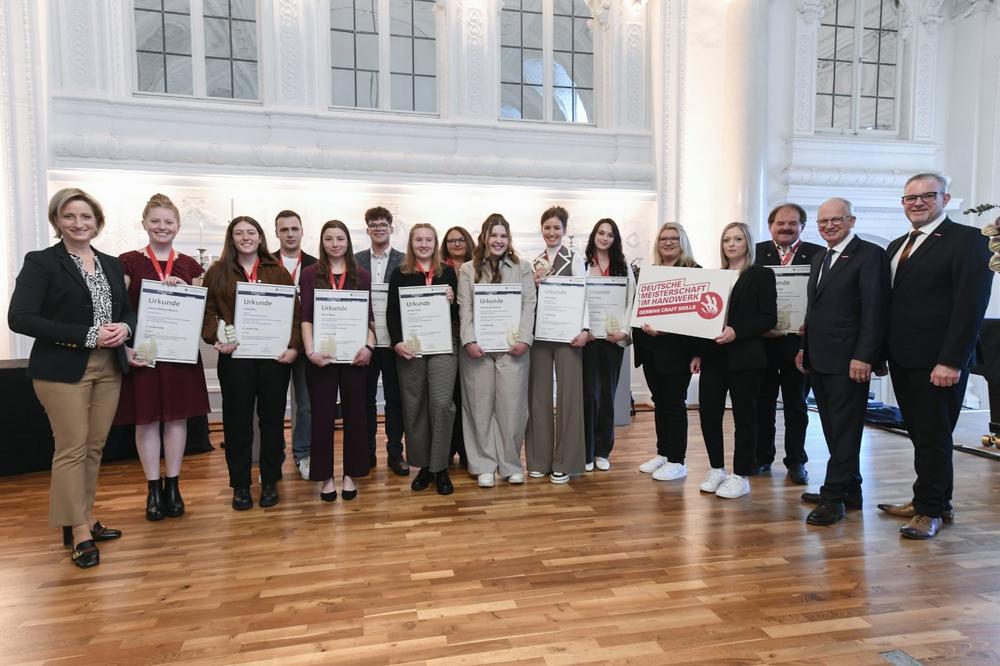Ergänzt wurde dieses starke Ergebnis durch zehn zweite und acht dritte Plätze auf Landesebene. 16 junge Handwerker und 14 junge Handwerkerinnen schafften somit den Sprung auf das Siegertreppchen. Diese nahezu ausgeglichene Bilanz zwischen Frauen und Männern zeigt eindrucksvoll, dass handwerkliches Können und Spitzenleistungen längst keine Frage des Geschlechts und des Gewerks sind mehr sind. Sie unterstreicht vielmehr, wie vielfältig und chancengleich das moderne Handwerk heute aufgestellt ist. Im parallel stattfindenden Gestaltungswettbewerb „Die gute Form im Handwerk“, der in rund 40 Gewerken ausgetragen wird, gingen außerdem zwei erste Preise an eine Maßschneiderin und einen Goldschmied, ein zweiter Preis ebenfalls an eine Maßschneiderin.