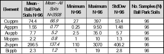 Einundzwanzig der 96 Bodenproben bei Ball Park lieferten Werte von mehr als 100 ppm Kupfer; der Höchstwert betrug 397 ppm Cu. 24 der 96 Proben enthielten mehr als 2 ppm Silber bzw. maximal 9,5 ppm Ag (siehe Tabelle 1 und Abbildung 1).