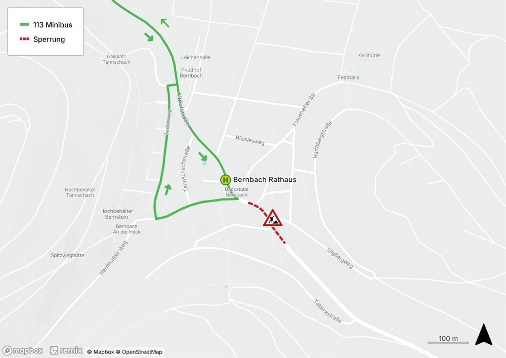 Betroffen sind durch die Vollsperrungen auch die Busse der Linie 113, die ab dem 24. November ebenfalls eine weiträumige Umleitung über das Moosalbtal, Burbach und Albtal fahren müssen. Aufgrund der beengten Situation innerhalb von Bernbach kommt weiterhin nur ein Minibus mit rund 30 Sitz- und Stehplätzen zum Einsatz. Im Zusammenhang mit der Umleitungsstrecke und der deutlich längeren Fahrzeit sowie im Hinblick auf die Sicherstellung der Schulverkehre kann kein durchgehender Stundentakt angeboten werden.