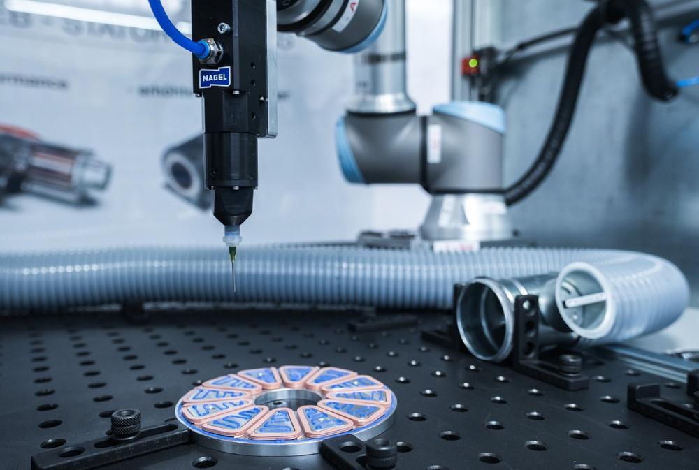 The NaDos Robot Cell is particularly suited for adhesive applications in e-mobility, such as bonding stators in axial flux motors. Thanks to its six-axis kinematics, it can process both 2D and 3D contours, even in difficult angles or overhead applications. The working area features a 1200 x 800 mm perforated table with variable clamping elements.