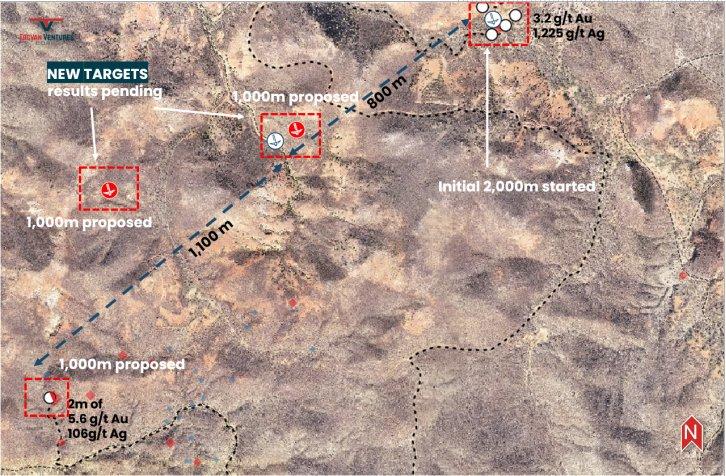 Bis heute hat das Unternehmen die ersten Vorbereitungen vor Ort abgeschlossen, darunter die Verbesserung der Zufahrtsstraßen und die Einrichtung der ersten Bohrplattformen. Die Bohrarbeiten schreiten voran, wobei in der ersten Phase 2.000 Meter geplant sind, und der Schwerpunkt auf vorrangigen Zielen innerhalb der nördlichen Alterationszone liegt. Diese Zone hat bereits vielversprechende Oberflächenproben geliefert, darunter eine Gesteinssplitterprobe über 2 Meter mit einem Gehalt von 5,6 g/t Au und 106 g/t Ag sowie eine historische Probe aus einer Abbaustelle mit einem Gehalt von 3,2 g/t Au und 1.225 g/t Ag.
