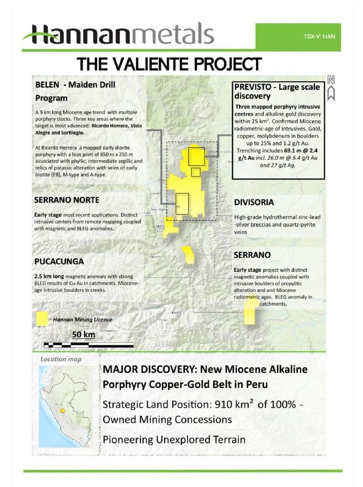 During 2021 Hannan staked and still holds 910 km2 of 100% owned mining concessions at Valiente covering unexplored terrain for potential mineralized porphyry targets in central eastern Peru. The Valiente Project has rapidly evolved from a greenfields prospect to a multi-prospect opportunity.