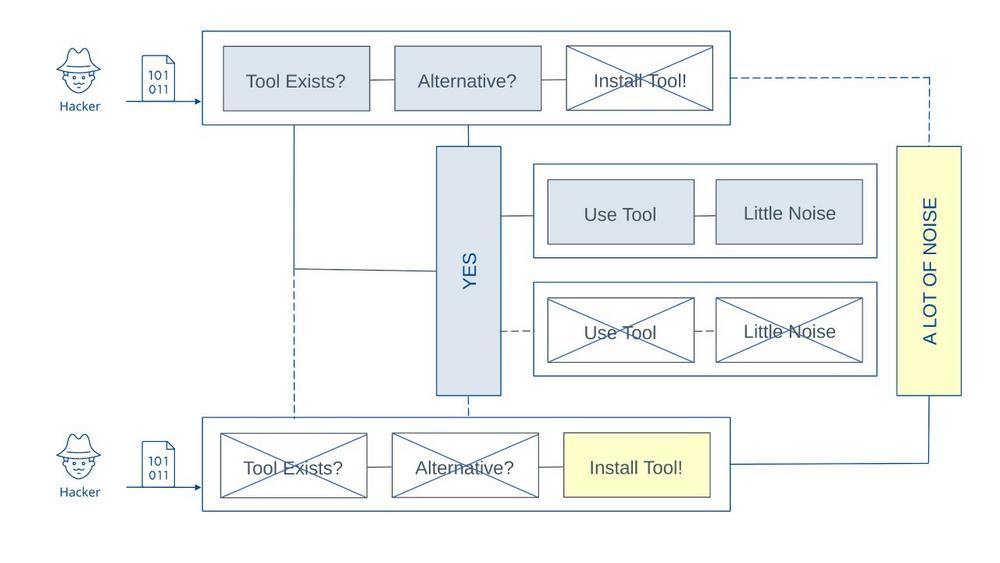 2. Tool Selection Noise: The decision point between native and custom tools creates distinctive behavioral branches. Attackers evaluating available utilities generate file system and process inspection patterns. Those retrieving external tools create network connection artifacts. Those improvising with unexpected native functionality generate anomalous command sequences. Each branch produces detectable decision signatures.