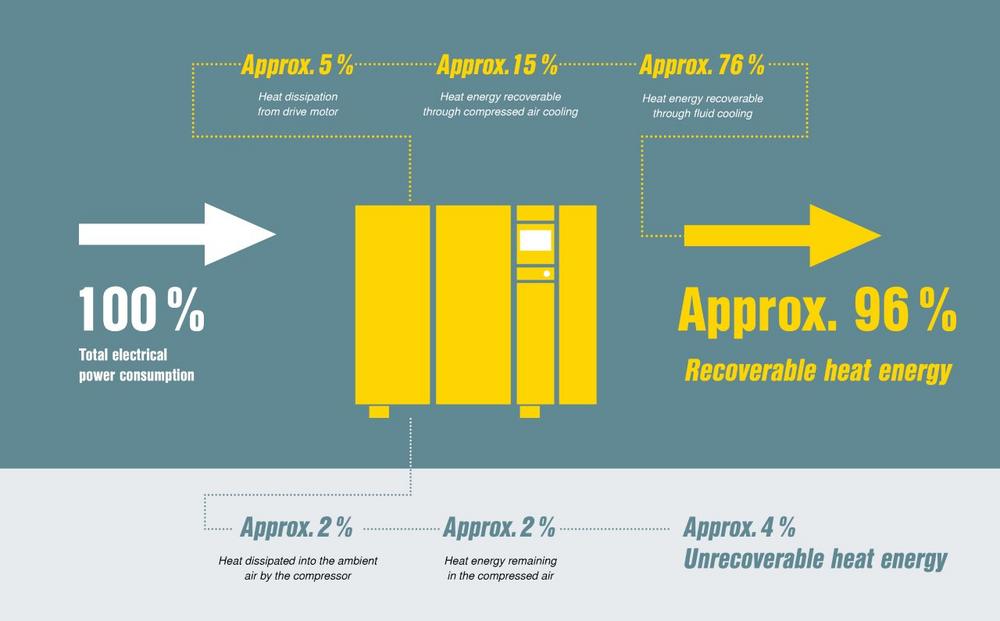 100 percent of the drive energy fed to a compressor is converted into heat. Air- and water-cooled rotary screw compressors are the best-suited compressor technologies for efficient heat recovery. The greatest part of the energy consumed by these compressors, some 76 percent, is transferred to the cooling medium. A further 15 percent is transferred to the compressed air, and heat losses from the electrical motor account for up to 5 percent. Modern, fully-encapsulated rotary screw compressors can use targeted cooling to recover this energy. In total therefore, 96 percent of the electrical drive energy fed to the compressor can be reused for heating purposes. Only about 2 percent of the energy is lost as radiant heat and about 2 percent remains as heat in the compressed air.