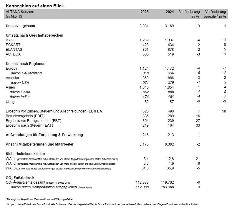Der Spezialchemiekonzern ALTANA hat das Geschäftsjahr 2025 trotz weiterhin schwieriger Marktbedingungen mit einem operativen Umsatzplus abgeschlossen. Bereinigt um Währungs- sowie Akquisitions- und Desinvestitionseffekte stieg der Umsatz um 1 Prozent gegenüber dem Vorjahr. Der nominale Umsatz sank hauptsächlich infolge negativer Wechselkurseffekte um 3 Prozent auf 3.081 Millionen Euro (Vorjahr: 3.169 Millionen Euro). Das Ergebnis vor Zinsen, Steuern und Abschreibungen (EBITDA) erhöhte sich um 7 Prozent auf 523 Millionen Euro (Vorjahr: 490 Millionen Euro). Die EBITDA-Marge lag bei 17,0 Prozent (Vorjahr 15,5 Prozent).