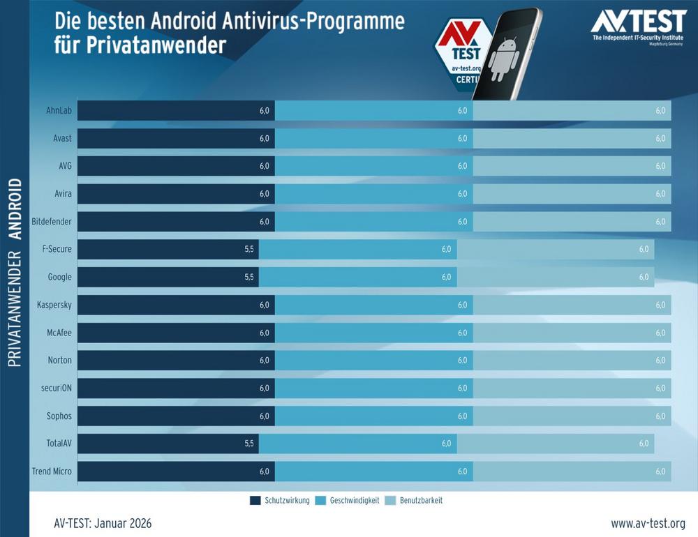 14 Sicherheitslösungen für Android hat das AV-TEST Institut im Januar 2026 geprüft. Alle Apps und Services wurden in realistischen Tests in den Bereichen Schutzwirkung (Protection), Geschwindigkeit (Performance), Benutzbarkeit (Usability) und weiteren Funktionen (Features) untersucht.