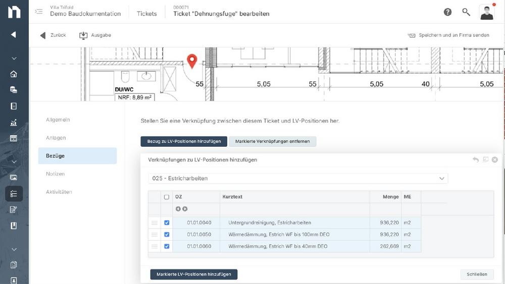 In der LPH 8 sollen Baudokumentation, Aufgaben- und Mängelmanagement, Besprechungsorganisation und Abrechnung reibungslos ineinandergreifen. Das Herzstück der Neuerungen in NOVA AVA ist daher das Ticket- und Mängelmanagement. Die Tickets sind nahtlos in die AVA-Plattform integriert – ein entscheidender Vorteil für Anwender. Denn sie lassen sich direkt mit Positionen im Leistungsverzeichnis verknüpfen und sind in der Bauabrechnung als offene Punkte sichtbar. Unberechtigte Abrechnungen von Mängeln werden dadurch verhindert.
